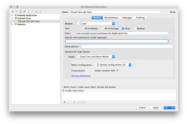 Android Studio 中的新界面允许您配置要在云端测试实验室中运行的测试组合,还可让您查看测试结果。
