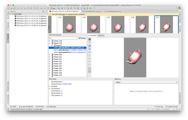 GPU 调试器预览版如果您正在开发 OpenGL ES 游戏或图形密集型应用,Android Studio 2.0 中为您提供了一款新的 GPU 调试器。虽然 GPU 调试器还只是预览版,但您可以逐帧对应用进行单步调试,以便通过有关 GL 状态的丰富信息来确定和调试图形渲染问题。